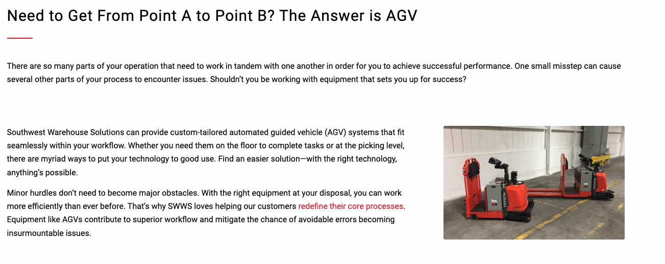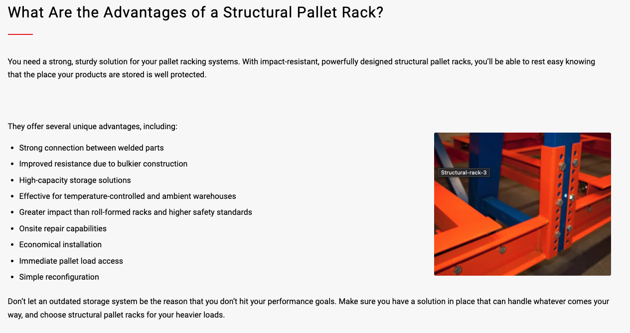 Southwest Warehouse Solutions, a warehouse engineering, installation, and optimization company, needed a website that incorporated industry-specific key search terms with audience-friendly, digestible product descriptions. I wrote every page of their website, from “Why Us?” to in-depth breakdowns of every single type of warehouse racking solution known to humankind. I’ve always loved taking complex, hyper-specific industry jargon and transforming it into something any audience can understand, and this project required a ton of “dumbing down” so that even silly writers like me could understand the value add of a pallet rack.